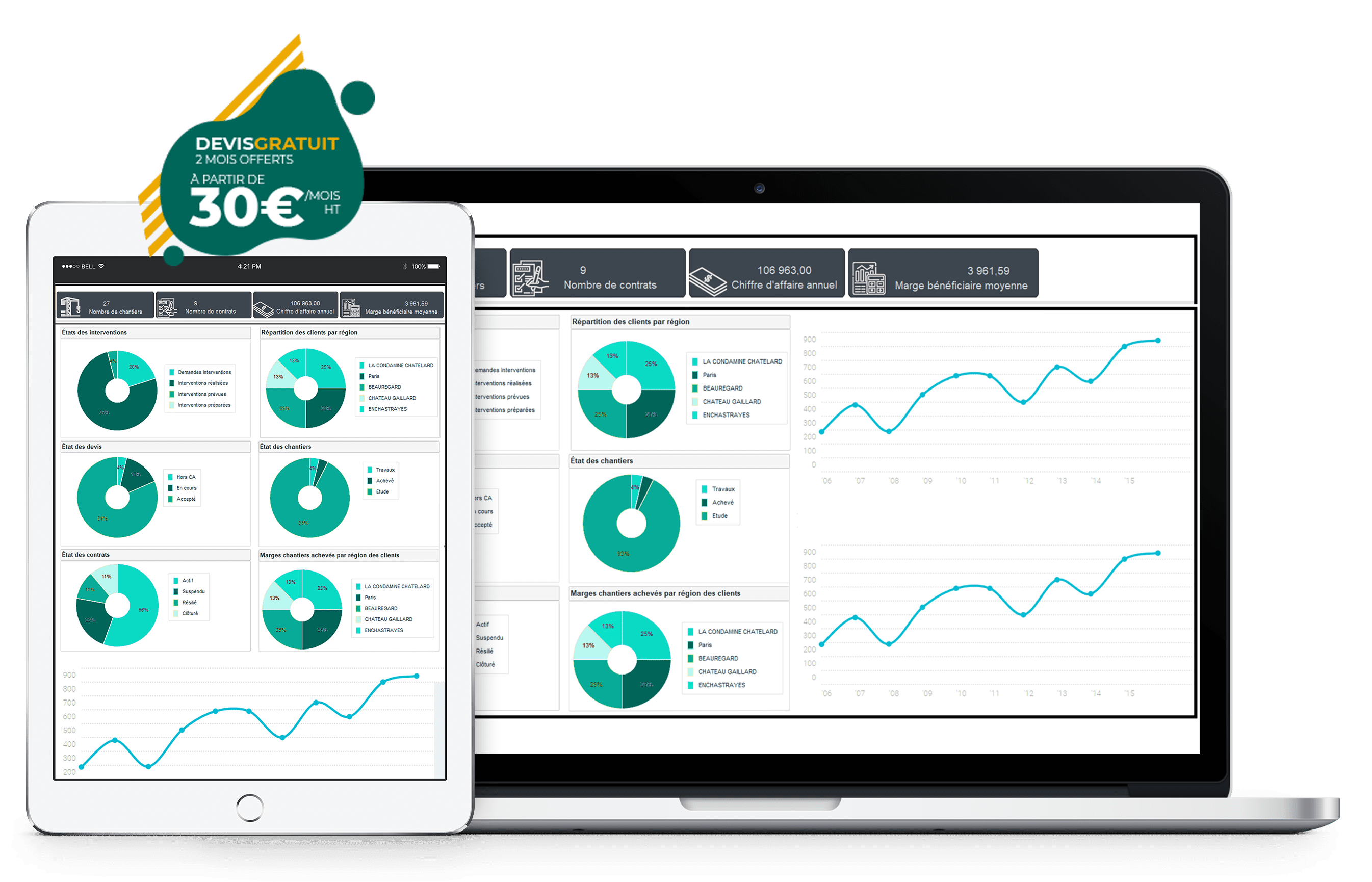 Notre logiciel bâtiment vous donnera la possibilité de gérer à partir d’une seule interface l’ensemble des opérations à effectuer tel que la gestion des ventes, des achats, des interventions ainsi que le suivi détaillé et l’affichage des statistiques afin que vous puissiez observer l’avancement de votre activité.
